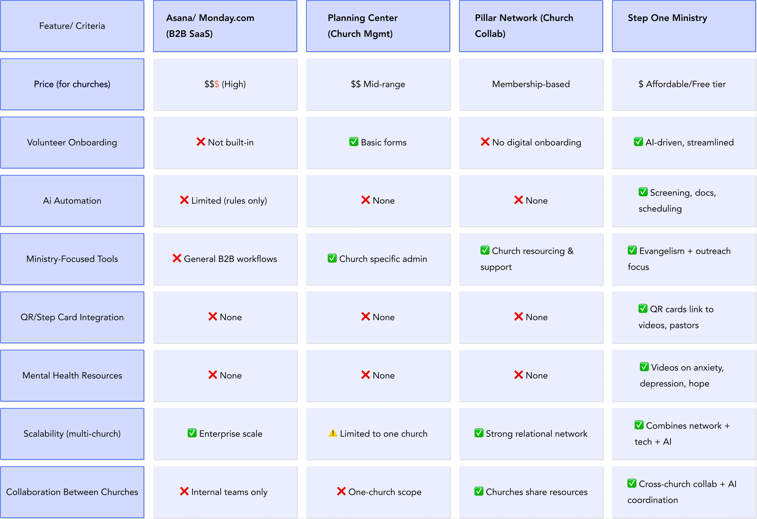 Building on the benchmark audit, I created a competitive matrix comparing Step One Ministry against both business SaaS tools and church platforms/networks.