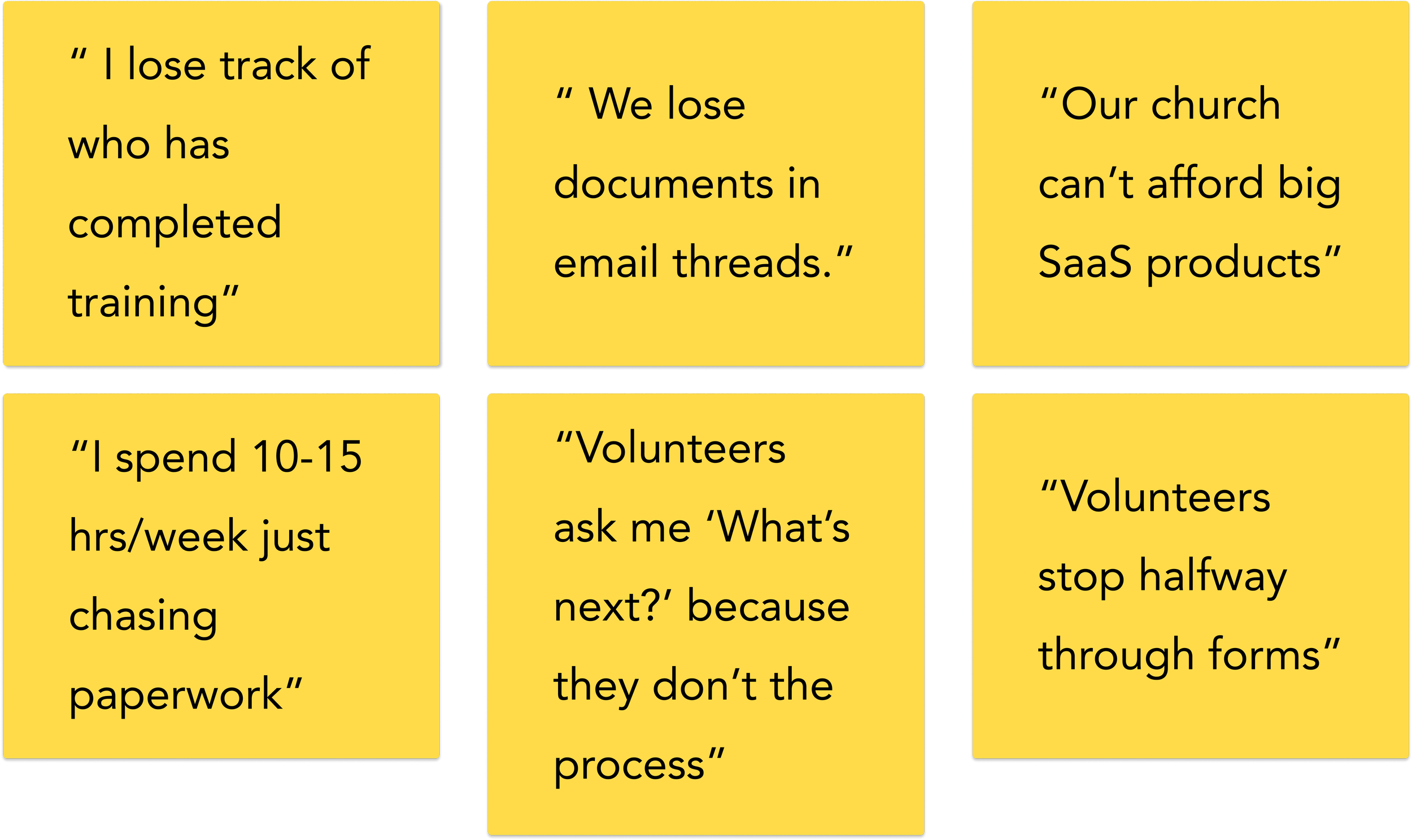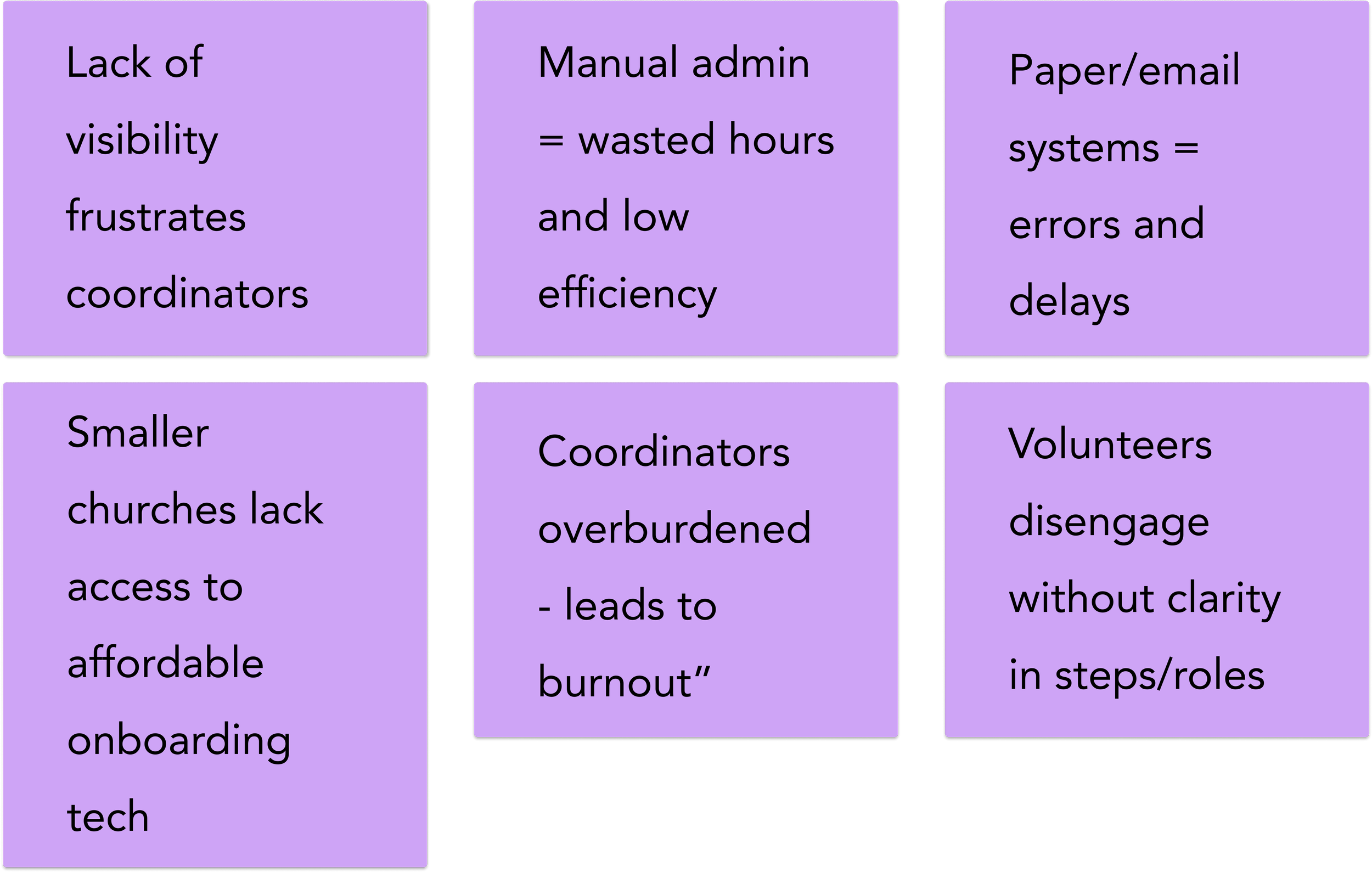 I conducted interviews, surveys, and audits with church leaders, coordinators, and volunteers, while also benchmarking against non-profit/SaaS onboarding tools.