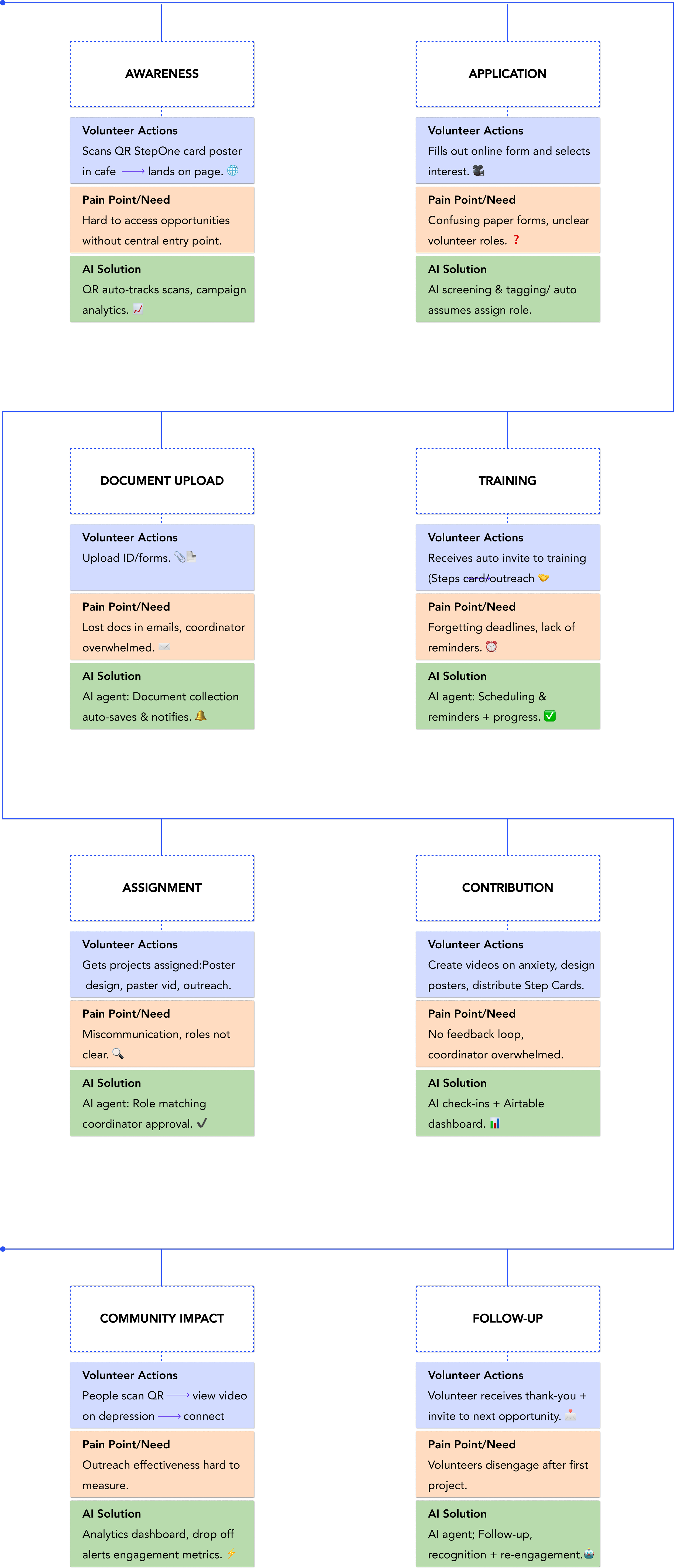 As the sole UX Designer & Researcher, I led the end-to-end design of Step One’s volunteer onboarding system, powered by AI Agents (Application Screening, Document Collection, Scheduling, Training, Role Assignment, and Follow-Up).