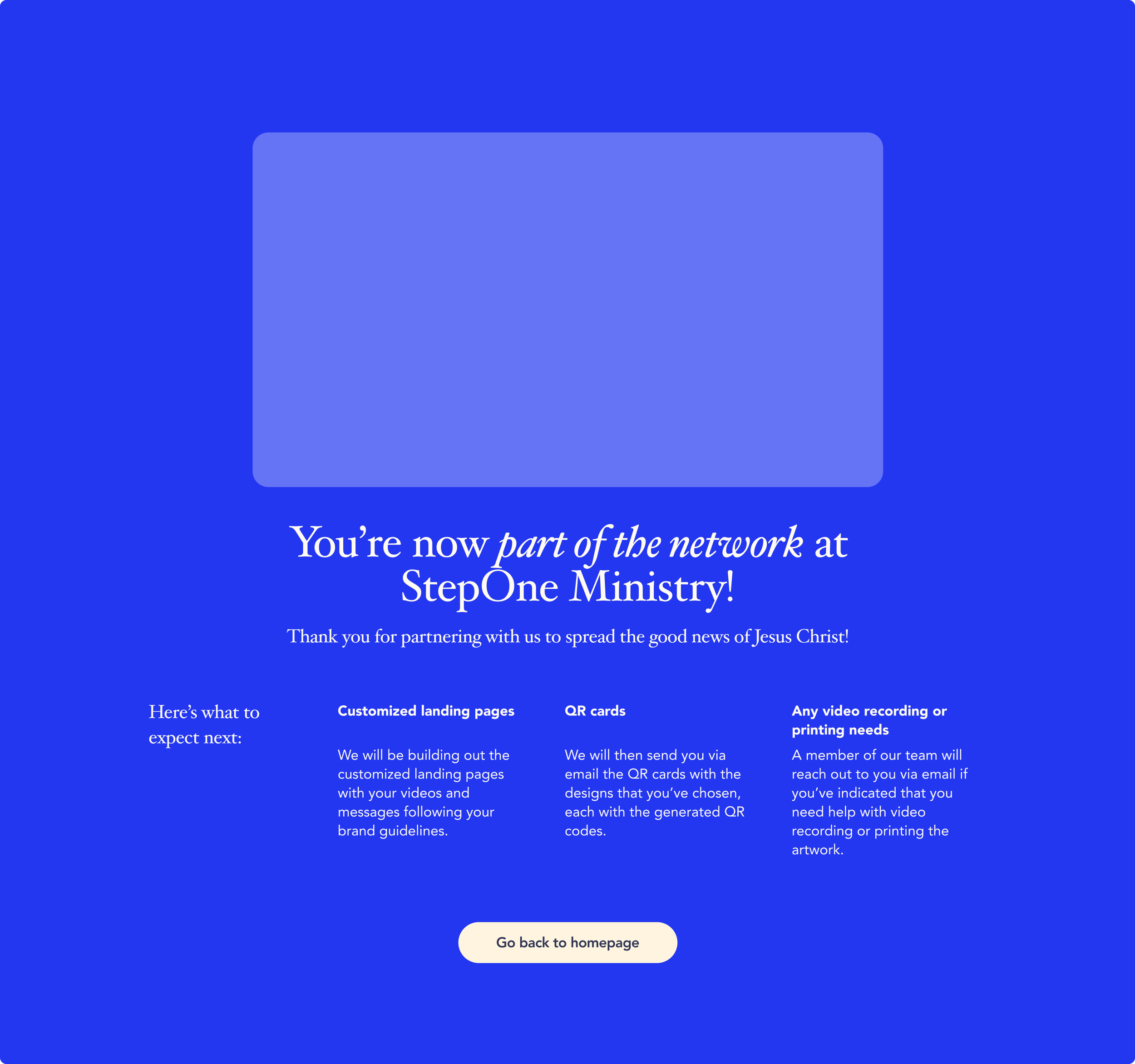 After submitting their materials, churches receive confirmation that they’ve officially joined the Step One Ministry network. This screen outlines the next steps—custom landing page creation, QR card delivery, and optional video or printing support—bringing the full content design process to completion.