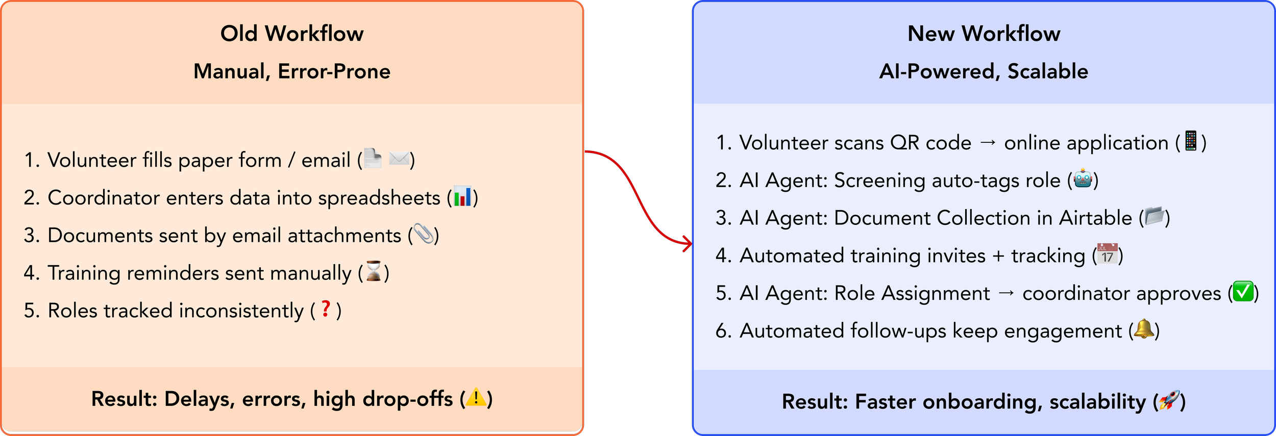 Time Savings → Reduced onboarding from weeks to days, saving ~10 hrs/week for coordinators.