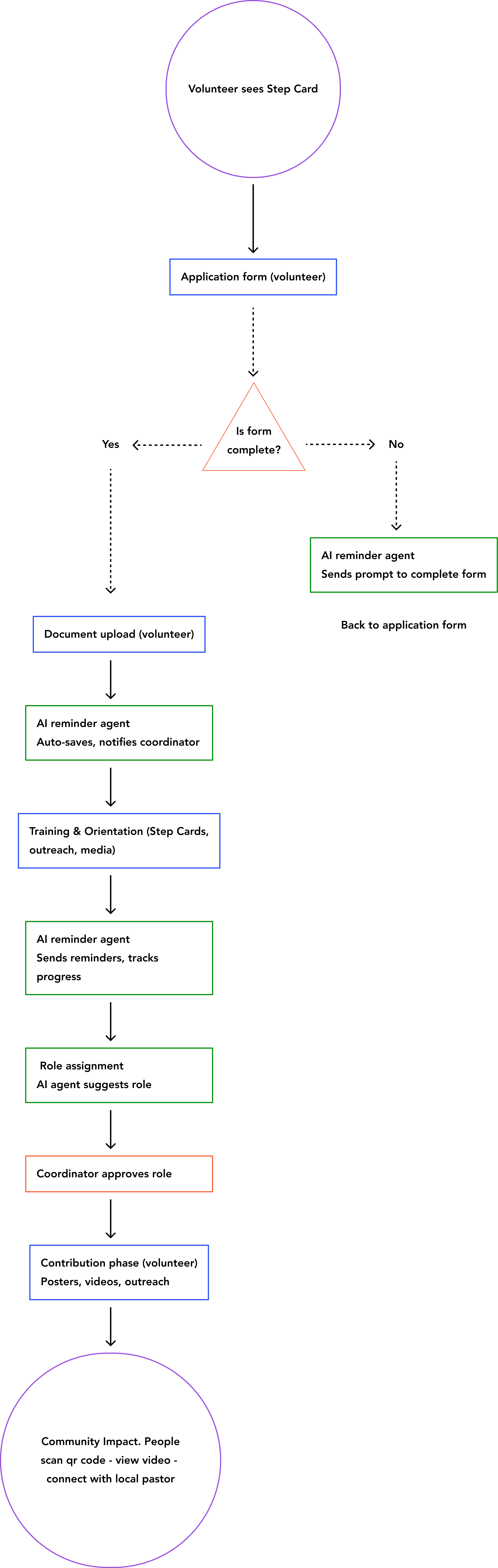 To align with the mission, the volunteer journey was designed around both AI automation and evangelism outcomes: