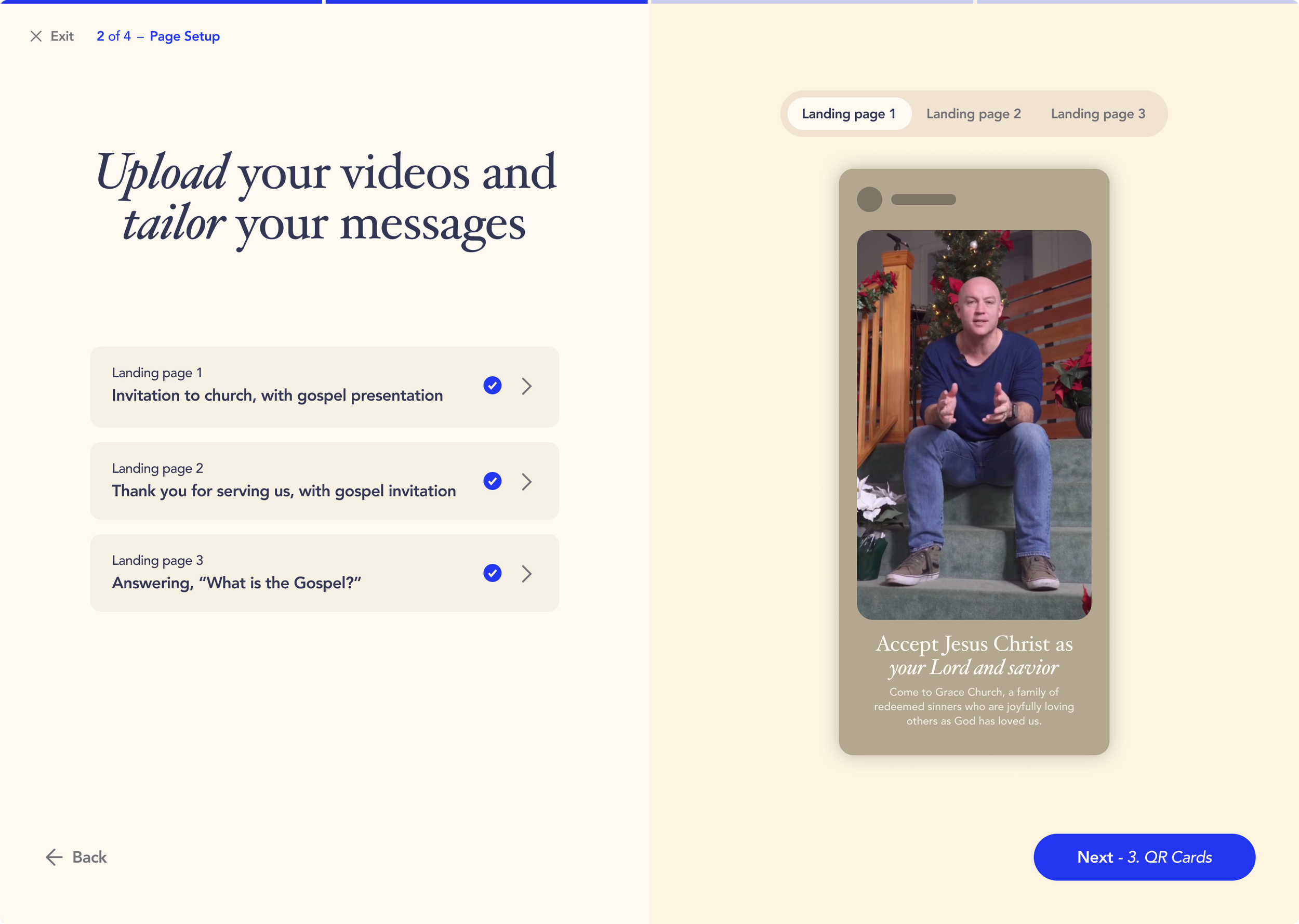 Churches begin by selecting the landing pages they’d like Step One to set up—each one uniquely branded for their ministry. These pages serve different outreach goals, from inviting newcomers to explaining the gospel message, ensuring every video and QR card leads to a meaningful point of connection.