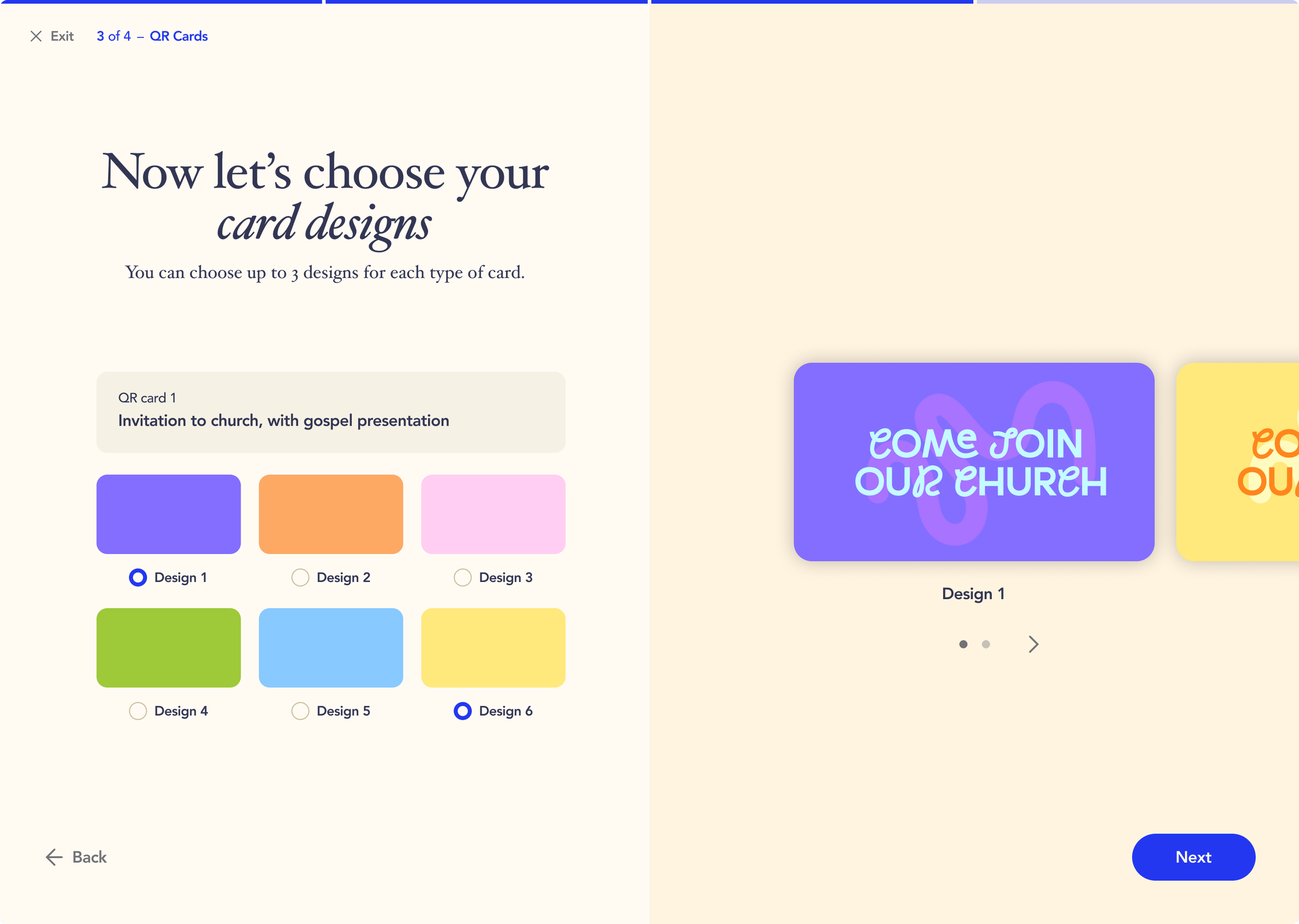 • Choose StepCard designs and color themes with built-in QR codes that connect to church-specific pages.